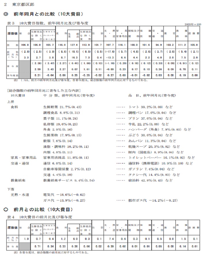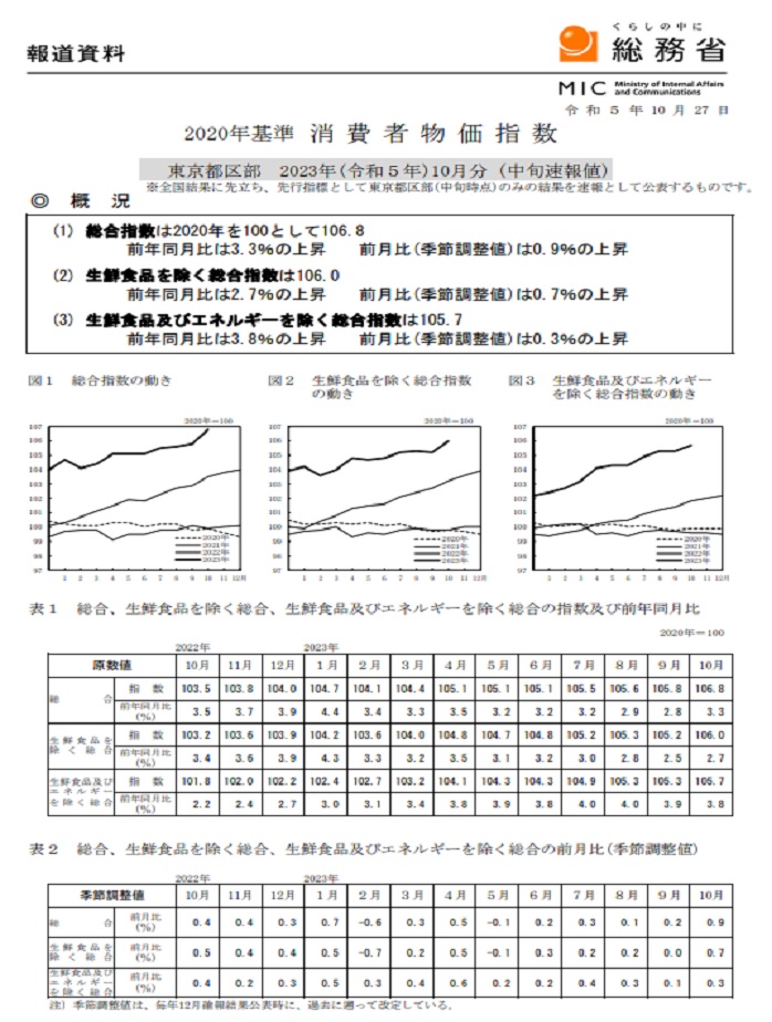 Á´¹ñ¤Î»Ø¿ô¤ËÀèΩ¤Ã¤Æ¸øÉ½¤µ¤ì¡¢Àè¹Ô»ØÉ¸¤È¤·¤ÆÃíÌܤµ¤ì¤ëÅìµþ23¶è¤Î¾ÃÈñ¼Ôʪ²Á»Ø¿ô¤Ï¡¢10·îÃæ½Ü»þÅÀ¤ÇÅ·¸õ¤Î±Æ¶Á¤ò¤¦¤±¤ëÀ¸Á¯¿©Éʤò½ü¤¤¤¿Áí¹ç»Ø¿ô¤¬106.0¤È¤Ê¤ê¡¢µîǯ10·î¤ÈÈæ¤Ù¤Æ2.7%¾å¾º¤·¤Þ¤·¤¿¡£