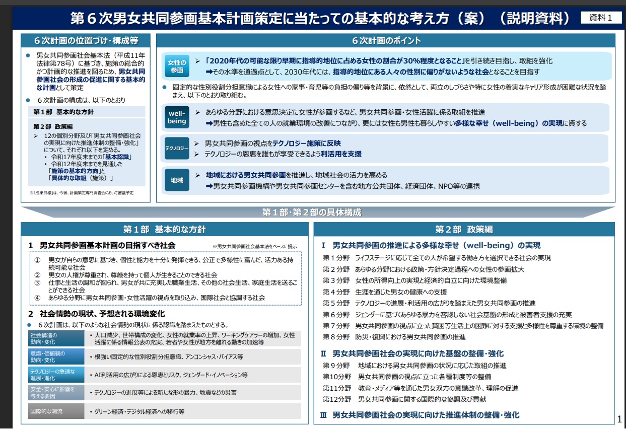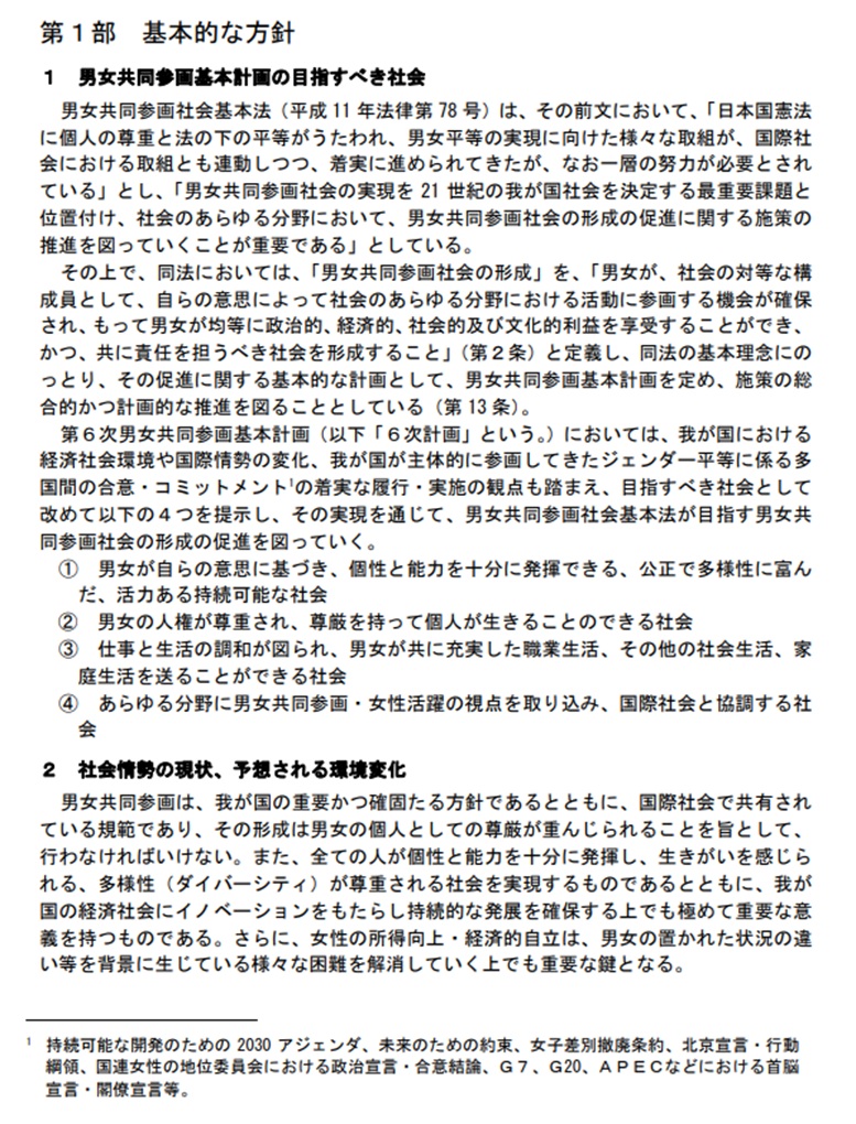 Âè°ì¾ò¡¡¤³¤ÎˡΧ¤Ï¡¢ ¼Ò²ñ¤ÎÂÐÅù¤Ê¹½À®°÷¤Ç¤¢¤ëÃ˽÷¤¬¸øÁª¤Ë¤è¤ë¸ø¿¦Ëô¤ÏÆâ³ÕÁíÍýÂç¿Ã¤½¤Î¾¤Î¹ñ̳Âç¿Ã¡¢ Æâ³Õ´±Ë¼ÉûĹ´±¡¢ Æâ³ÕÁíÍýÂç¿ÃÊ亴´±¡¢ÉûÂç¿Ã¡¢Âç¿ÃÀ¯Ì³´±¼ã¤·¤¯¤ÏÂç¿ÃÊ亴´±¼ã¤·¤¯¤ÏÉûÃλö¼ã¤·¤¯¤ÏÉû»ÔĮ¼Ĺ¤Î¿¦¡Ê¼¡¾ò¤Ë¤ª¤¤¤Æ¡Ö¸øÁª¤Ë¤è¤ë¸ø¿¦Åù¡×¤È¤¤¤¦¡£¡Ë¤Ë¤¢¤ë¼Ô¤È¤·¤Æ¹ñËô¤ÏÃÏÊý¸ø¶¦ÃÄÂΤˤª¤±¤ëÀ¯ºö¤ÎΩ°ÆµÚ¤Ó·èÄê¤Ë¶¦Æ±¤·¤Æ»²²è¤¹¤ëµ¡²ñ¤¬³ÎÊݤµ¤ì¤ë¤³¤È¡Ê°Ê²¼¡ÖÀ¯¼£Ê¬Ìî¤Ë¤ª¤±¤ëÃ˽÷¶¦Æ±»²²è¡×¤È¤¤¤¦¡£¡Ë¤¬¡¢¤½¤ÎΩ°ÆµÚ¤Ó·èÄê¤Ë¤ª¤¤¤ÆÂ¿Íͤʹṉ̃¤Î°Õ¸«¤¬Åª³Î¤ËÈ¿±Ç¤µ¤ì¤ë¤¿¤á¤Ë°ìÁؽÅÍפȤʤ뤳¤È¤Ë´Õ¤ß¡¢Ã˽÷¶¦Æ±»²²è¼Ò²ñ´ðËÜË¡¡ÊÊ¿À®½½°ìǯˡΧÂè¼·½½È¬¹æ¡Ë¤Î´ðËÜÍýǰ¤Ë¤Î¤Ã¤È¤ê¡¢À¯¼£Ê¬Ìî¤Ë¤ª¤±¤ëÃ˽÷¶¦Æ±»²²è¤Î¿ä¿Ê¤Ë¤Ä¤¤¤Æ¡¢¤½¤Î´ðËܸ¶Â§¤òÄê¤á¡¢Ê¤Ӥ˹ñµÚ¤ÓÃÏÊý¸ø¶¦ÃÄÂΤÎÀÕ̳Åù¤òÌÀ¤é¤«¤Ë¤¹¤ë¤È¤È¤â¤ËÀ¯¼£Ê¬Ìî¤Ë¤ª¤±¤ëÃ˽÷¶¦Æ±»²²è¤Î¿ä¿Ê¤Ë´Ø¤¹¤ë»Üºö¤Î´ðËܤȤʤë»ö¹à¤òÄê¤á¤ë¤³¤È¤Ë¤è¤ê¡¢À¯¼£Ê¬Ìî¤Ë¤ª¤±¤ëÃ˽÷¶¦Æ±»²²è¤ò¸ú²ÌŪ¤«¤ÄÀѶËŪ¤Ë¿ä¿Ê¤·¡¢¤â¤Ã¤ÆÃ˽÷¤¬¶¦Æ±¤·¤Æ»²²è¤¹¤ë̱¼çÀ¯¼£¤ÎȯŸ¤Ë´óÍ¿¤¹¤ë¤³¤È¤òÌÜŪ¤È¤¹¤ë¡£