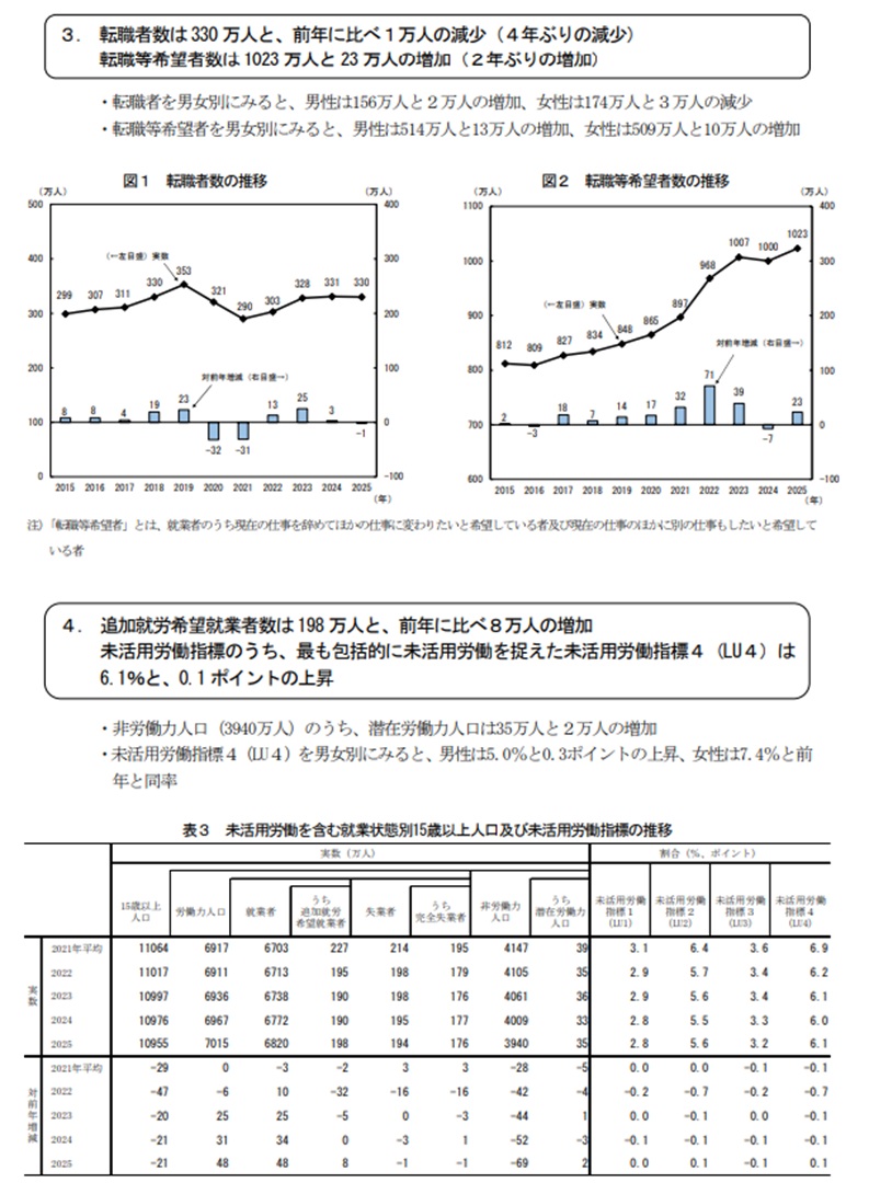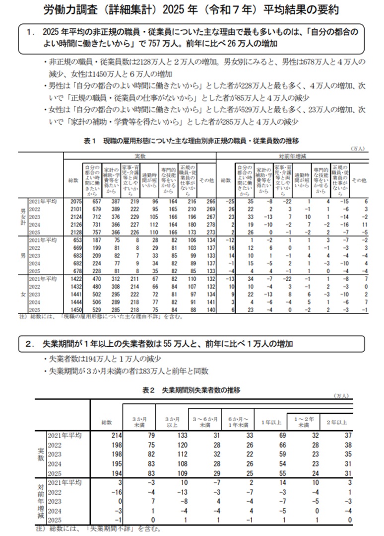 労働力調査(詳細集計)2025 年平均結果の要約・非正規の職員・従業員数は2128万人 |
