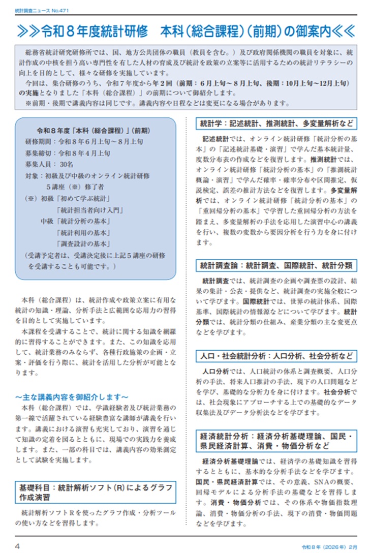 家計収支に関する結果の概要と令和8年度統計研修 本科(総合課程)(前期)の御案内 |