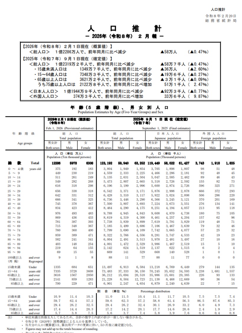 | 第2126回 人口推計(2025年9月確定値、2026年2月概算値)1億2286万人約58万人減少 |