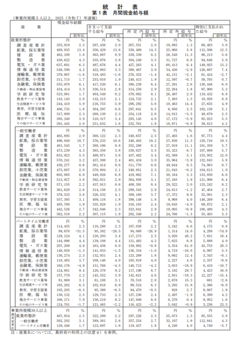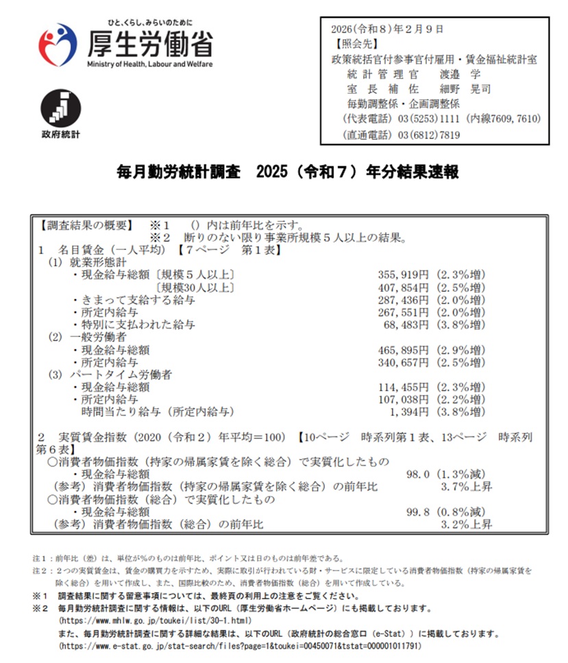 毎月勤労統計調査 2025年分結果速報現金給与総額一般労働者2.9%増パートタイム2.3%増 |