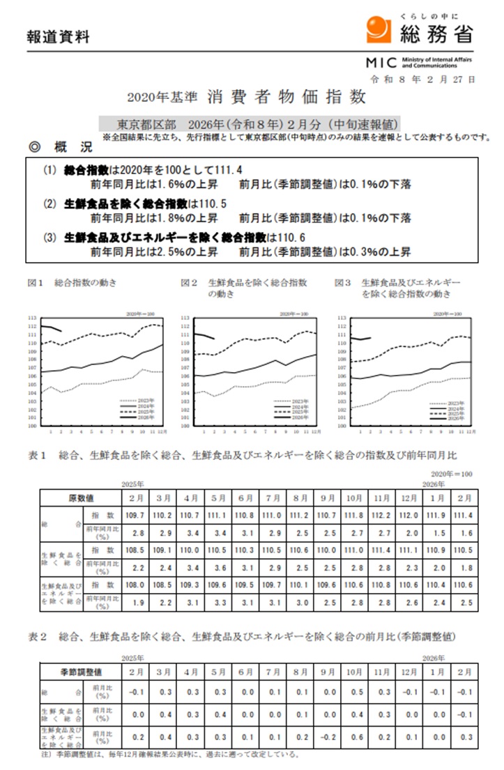 | 第2130回東京都区部 2026年2月分 消 費 者 物 価 指 数 前年同月比1.6%の上昇 |